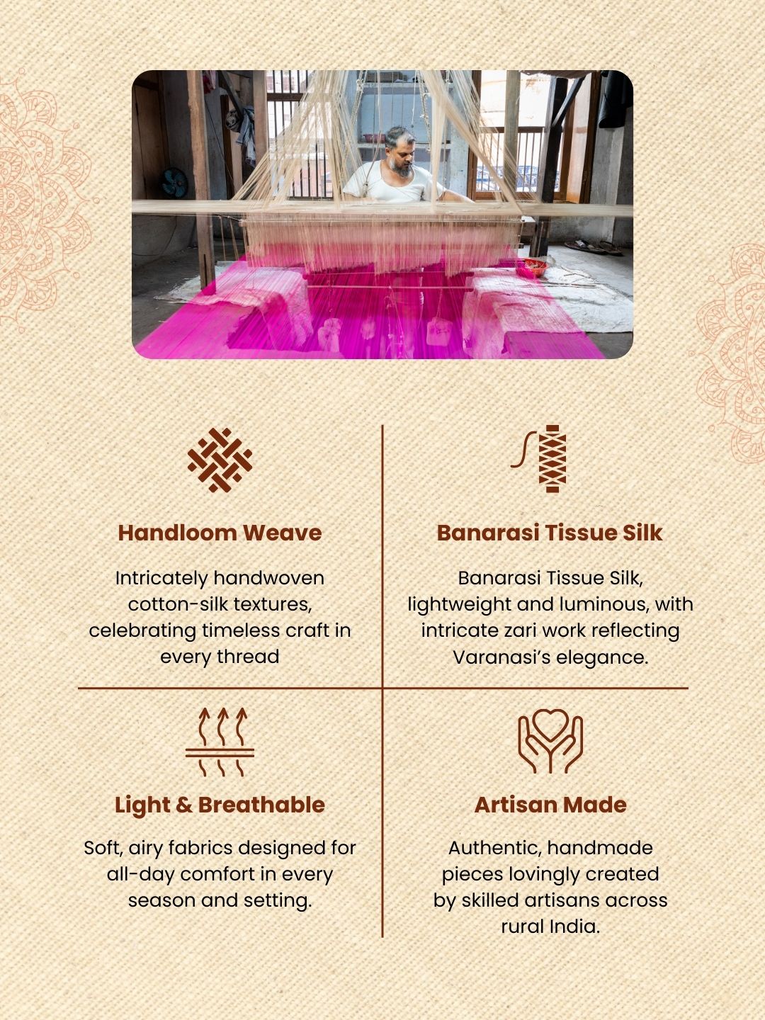 Experience timeless elegance with the Handloom Banarasi Crushed Tissue Saree, crafted with delicate weaving and a luxurious sheen. Lightweight, graceful, and festive, it’s perfect for weddings, parties, and traditional occasions.