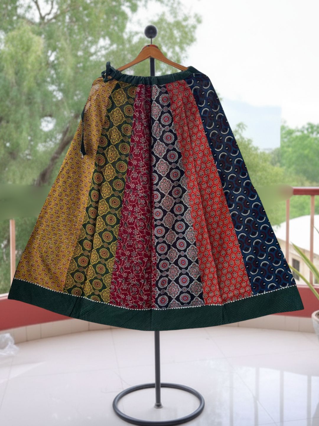 An Ajrakh Print Cotton Lehanga Skirt is a traditional flared skirt made from pure cotton and decorated with intricate Ajrakh block prints. Known for its earthy tones and geometric motifs, it blends ethnic charm with comfortable everyday wear.