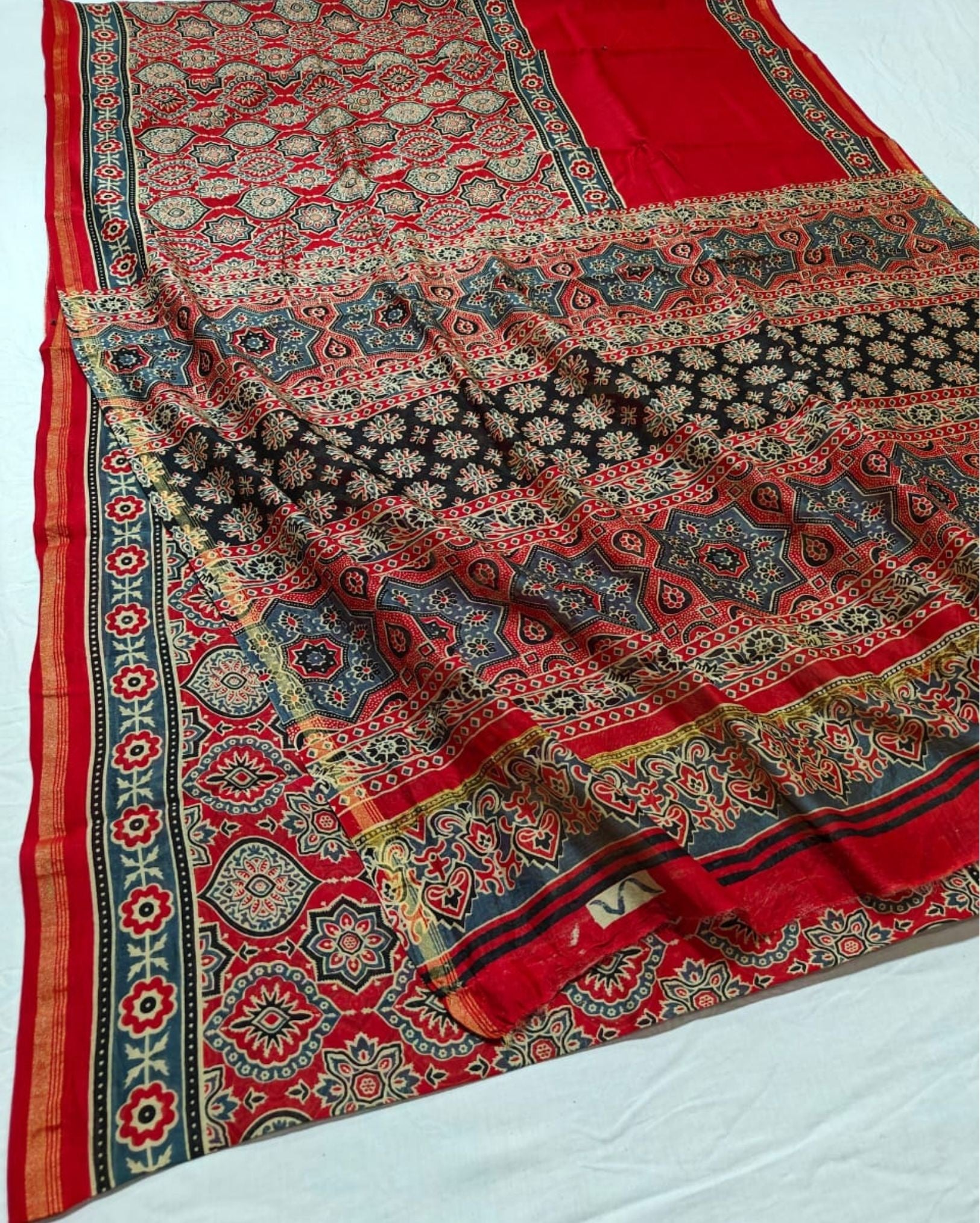 Elegant Chanderi Silk Saree featuring traditional Ajrakh Printing. Lightweight, breathable, and perfect for festive occasions or cultural events. A timeless blend of heritage craftsmanship and contemporary charm for your wardrobe.