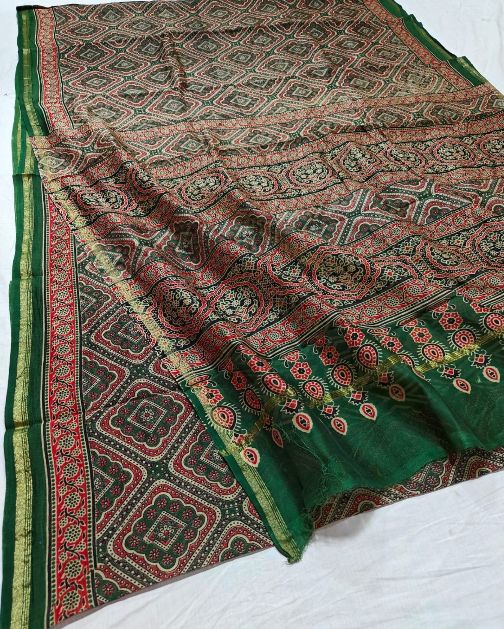 Goonj Chanderi Silk Jade Green Ajrakh Printed Saree