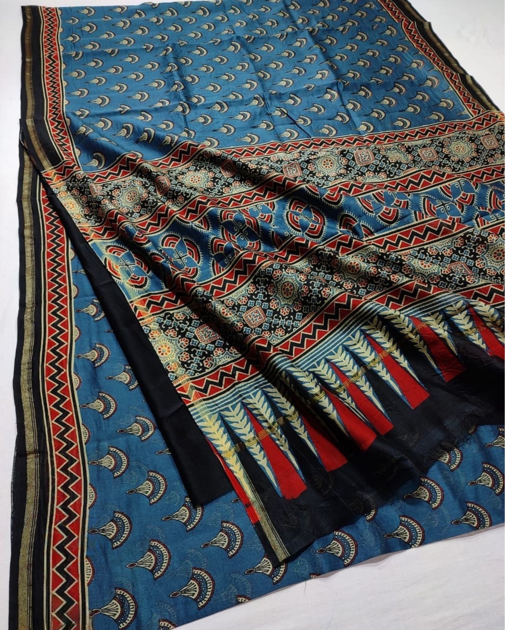 Elegant Chanderi Silk Saree featuring traditional Ajrakh Printing. Lightweight, breathable, and perfect for festive occasions or cultural events. A timeless blend of heritage craftsmanship and contemporary charm for your wardrobe.