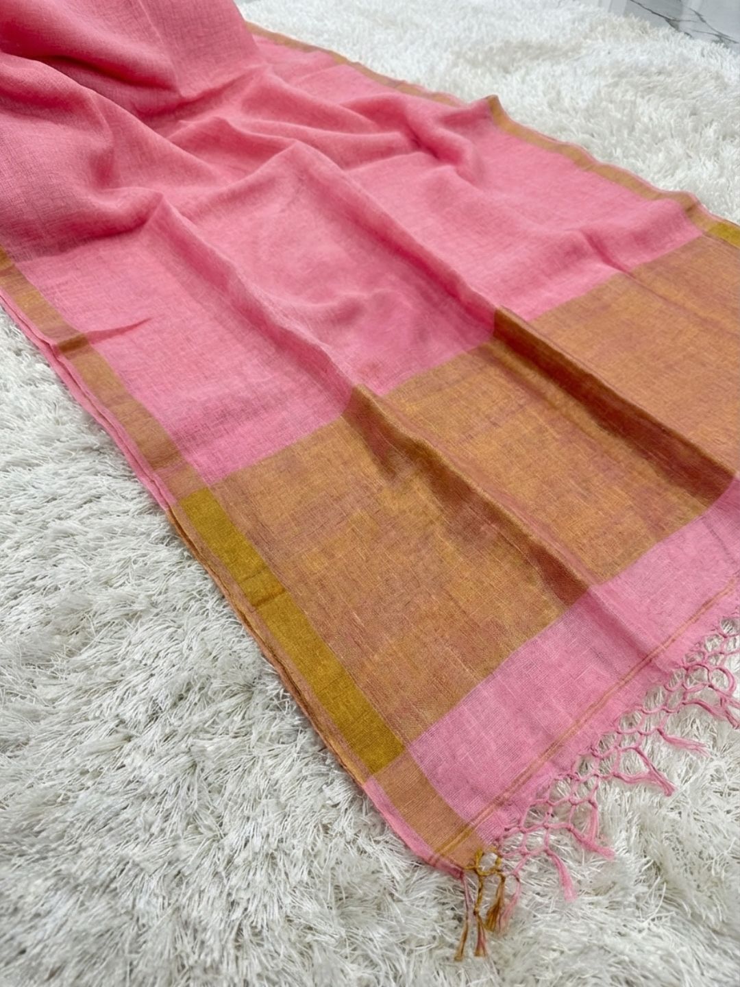 Pure linen handloom saree featuring an elegant zari border and detailed anchal. Lightweight, breathable, and refined, ideal for festive occasions, formal gatherings, or graceful everyday wear.