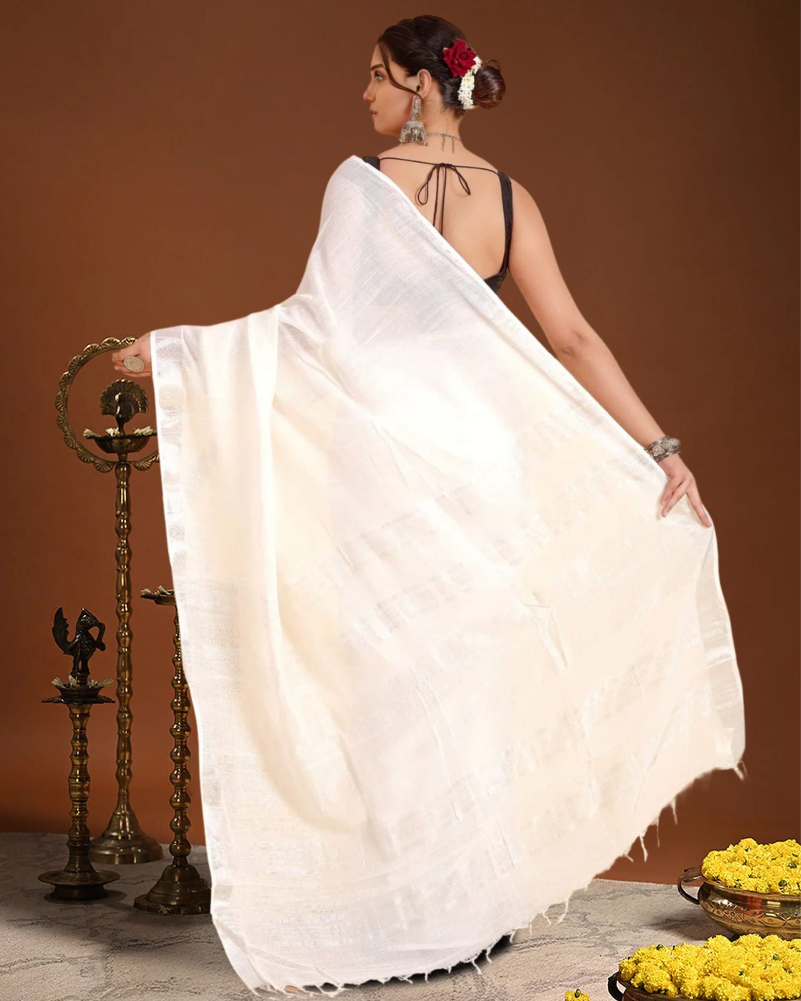 Elegant hand-dyed linen saree featuring a stylish striped pallu. Lightweight, breathable, and perfect for everyday elegance or festive charm. A blend of tradition and modernity for the contemporary woman.