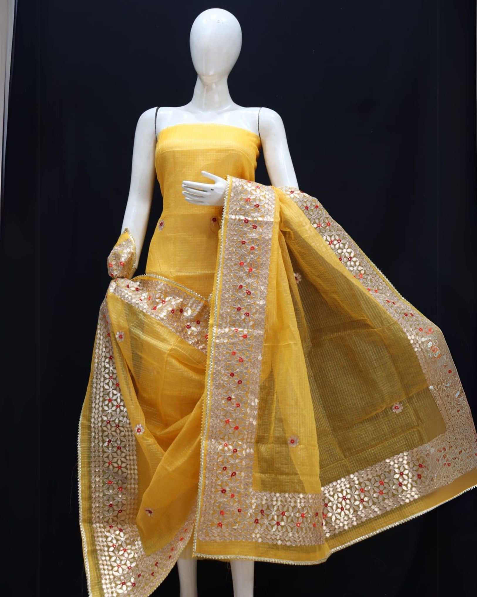 A Kota Cotton Gota Patti Embroidery Suit Set is a traditional Indian ensemble crafted from lightweight Kota cotton fabric, featuring hand-embroidered Gota Patti work. This set typically includes a top and a dupatta, offering a perfect blend of elegance, comfort, and festive charm.