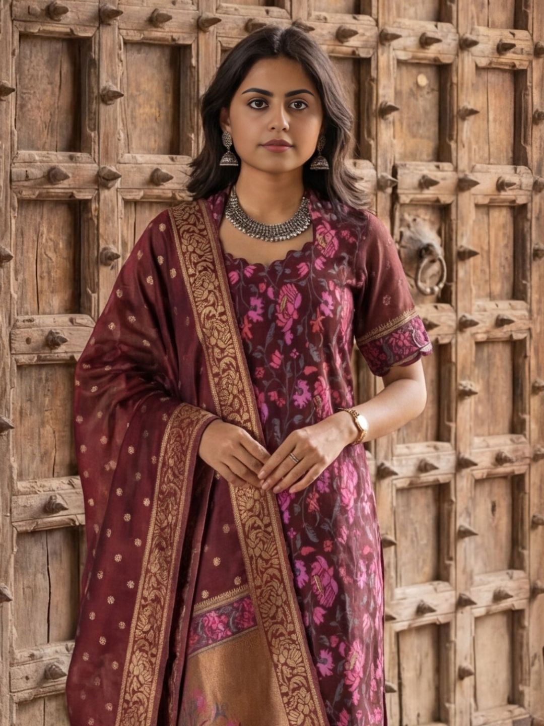 Banarasi silk stitched suits with lining, showcasing rich woven patterns and a refined finish. Comfortable and elegant, perfect for weddings, festive celebrations, or special occasions with classic Banarasi charm.
