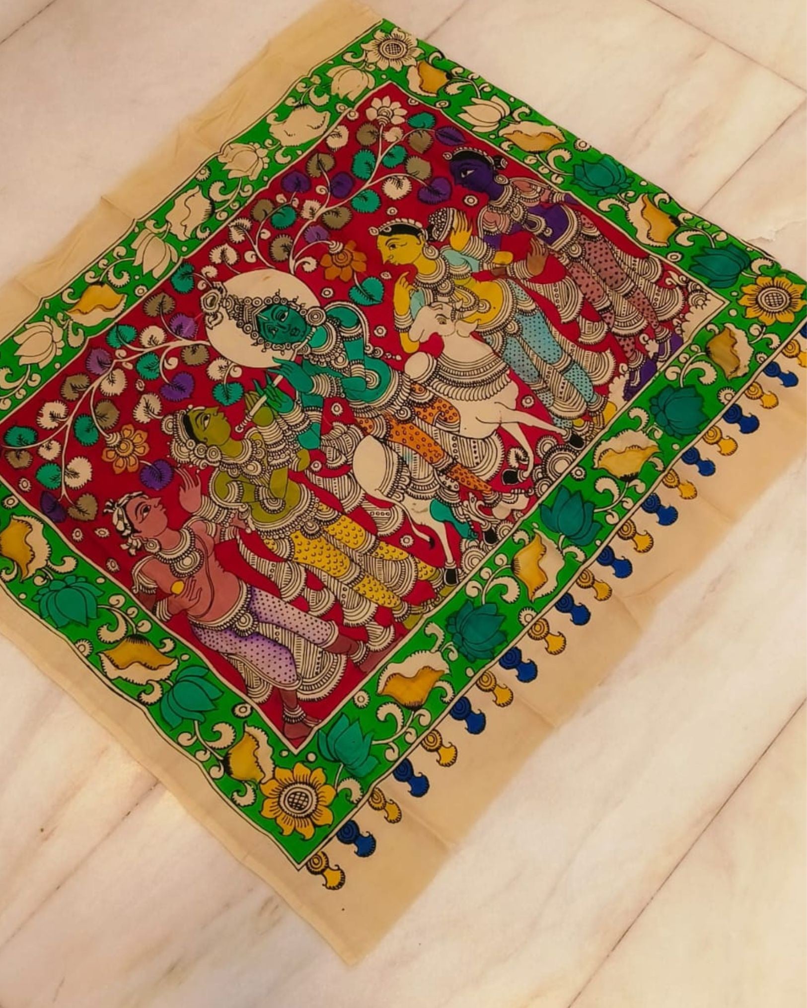 A symphony of colors dances on Bangalori silk, each brushstroke a tale, weaving dreams into a vivid tapestry of art.