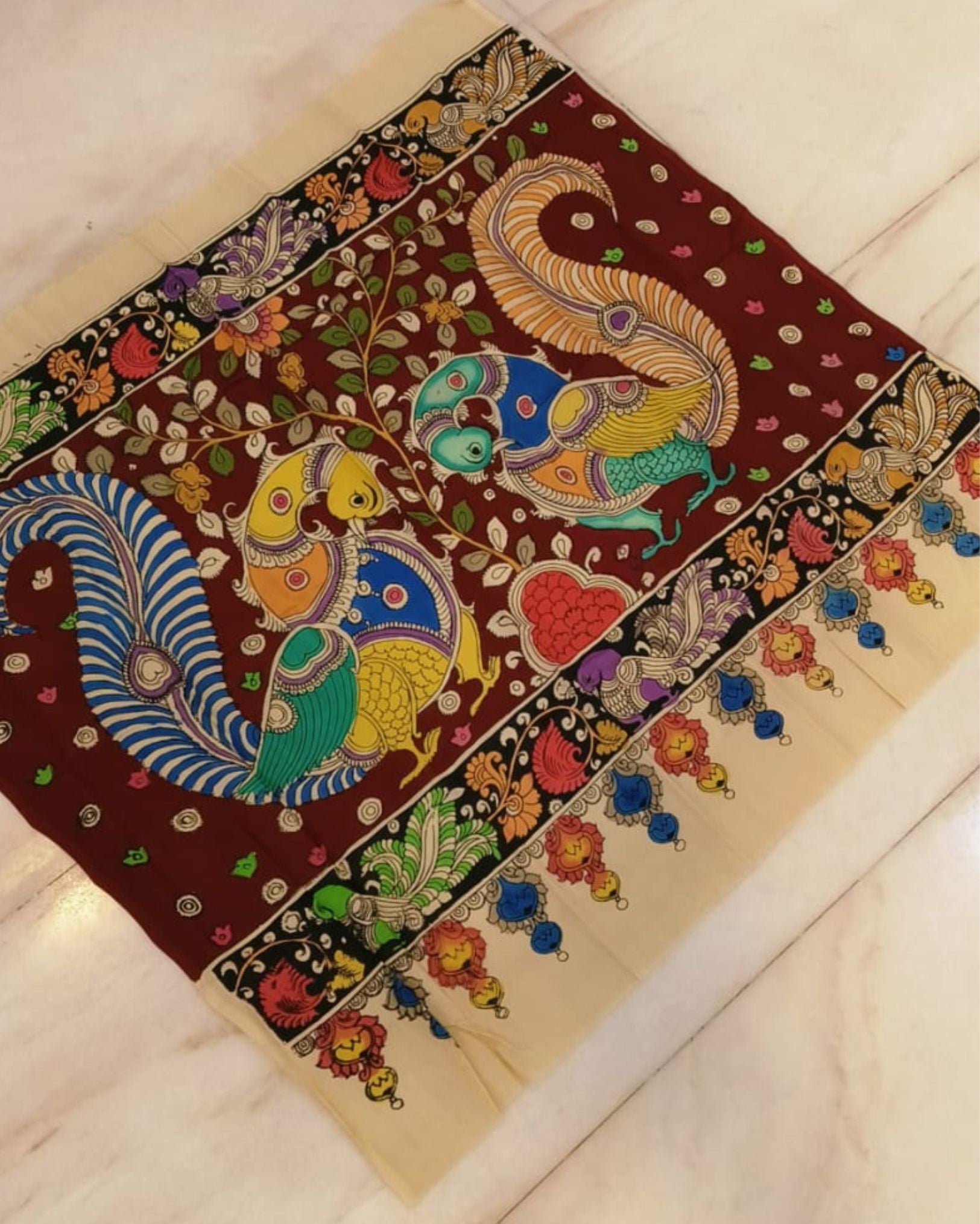 A symphony of colors dances on Bangalori silk, each brushstroke a tale, weaving dreams into a vivid tapestry of art.