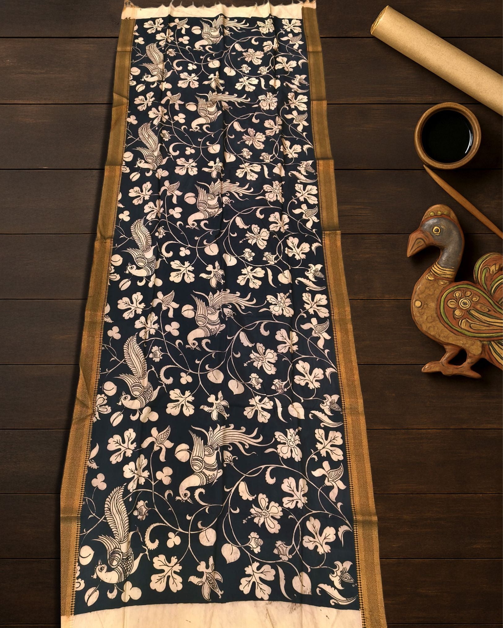 The dupatta is first made from Mangalagiri silk, known for its lightweight and durable texture. Skilled artisans then paint intricate designs by hand using special fabric dyes or paints. After the painting process, the fabric is set to ensure the colors don’t fade or bleed, preserving the vibrant designs.