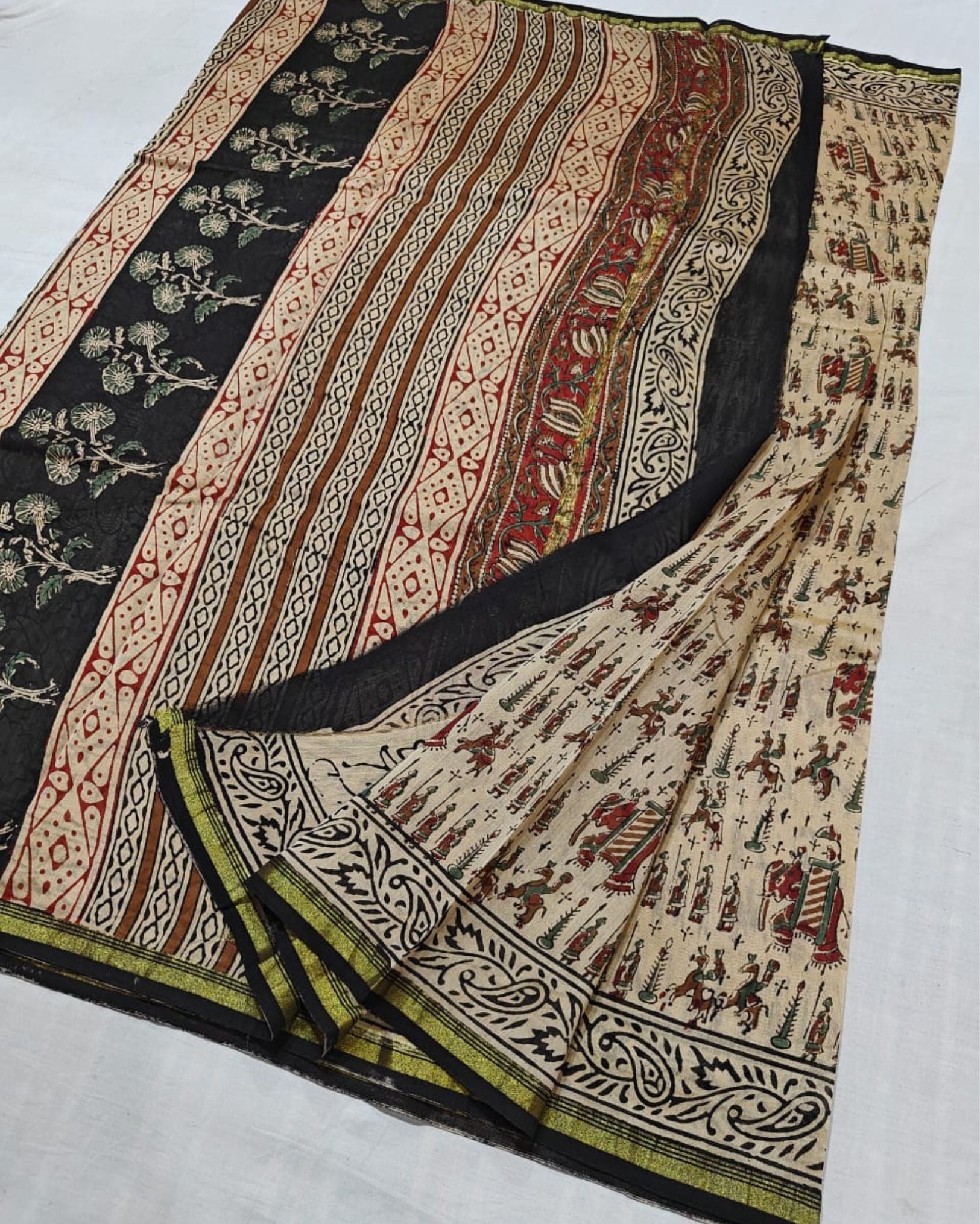 A Chanderi Silk Kalamkari Saree is a graceful saree made from luxurious Chanderi silk fabric, adorned with Kalamkari-style block prints. It combines the elegance of silk with the storytelling charm of traditional Indian art.